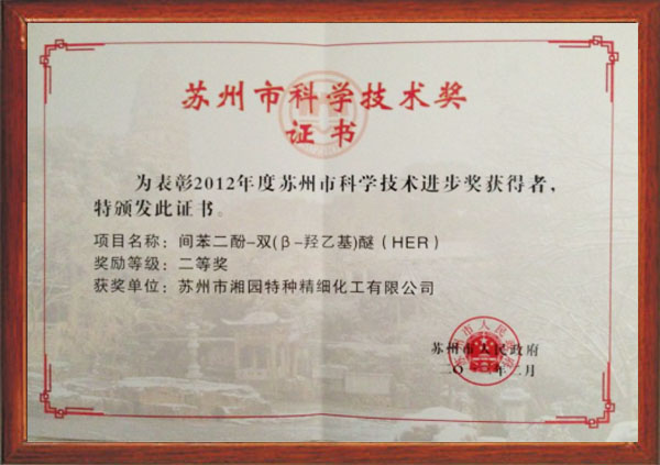 间苯二酚-双(β-羟乙基)醚(HER)获评为2012年度苏州市科学技术进步奖